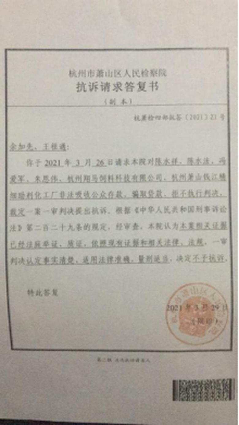 对于4月7日受害人委托律师提起的这样一份抗诉书,萧山区人民检察院三天后给出了回复:不予抗诉。