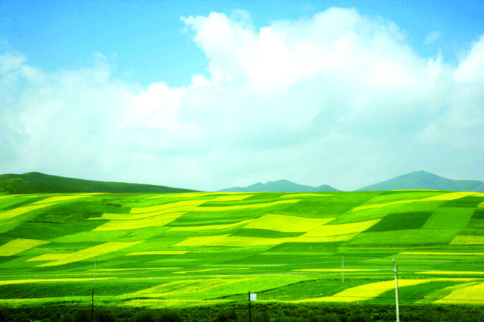 美丽的大草原,沃野千里。绿草盈盈,苍翠欲滴,生机勃勃。交织在绿草间的那一块块整齐金黄的油菜花田令人心醉神迷。绿的草,金的花,交相辉映,把山野织成了一块美丽的锦缎。天上白云悠悠,令人神清气爽。