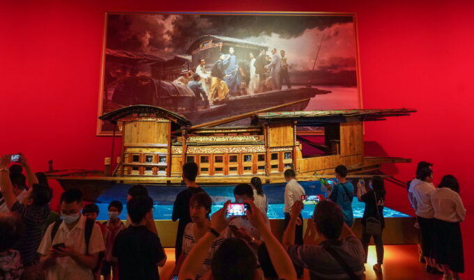 中共一大纪念馆人头攒动。鲜红的党旗前,参观者重温入党誓词的声音铿锵有力。