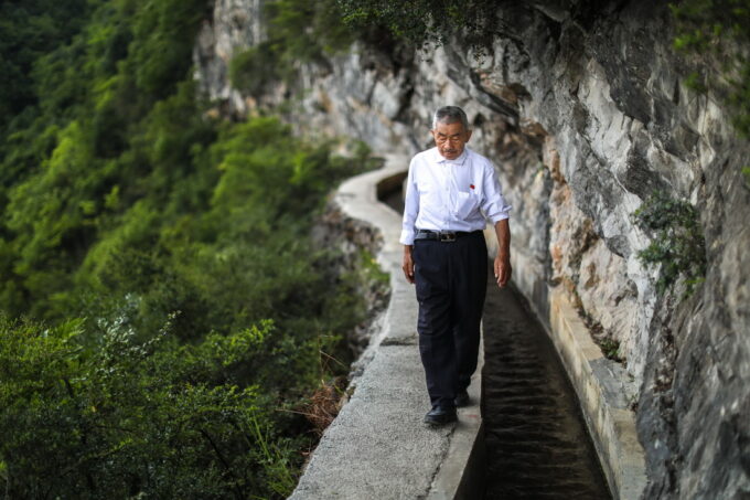 黄大发沿着修建在绝壁上的“大发渠”巡查(2018年8月11日摄)。