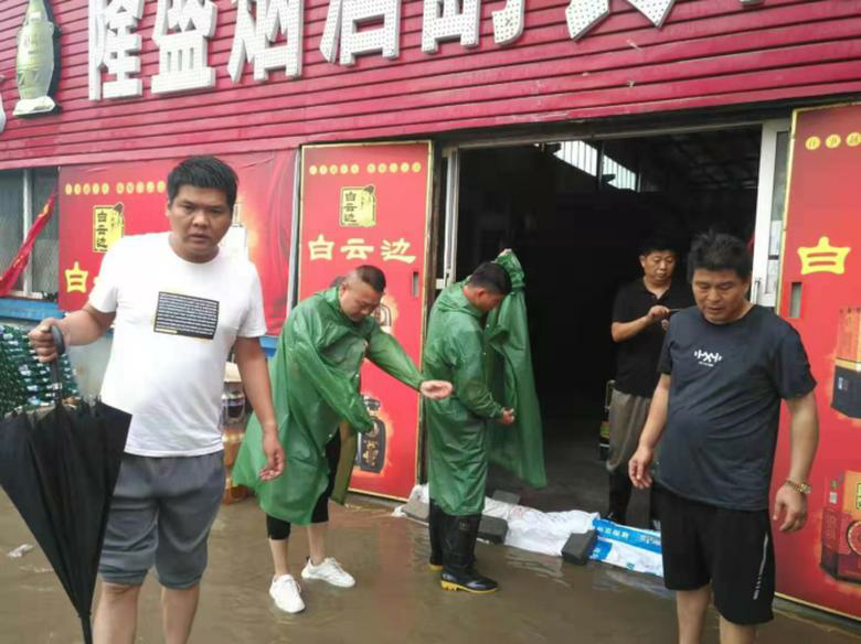 第二天一早,商户张红卫路过潩水商贸城,一看市场内雨水横流,立刻给东城区产业聚集区管理委员会打了电话,自己也马上加入到了排水行列,所以就有了上述紧张救灾场场面。