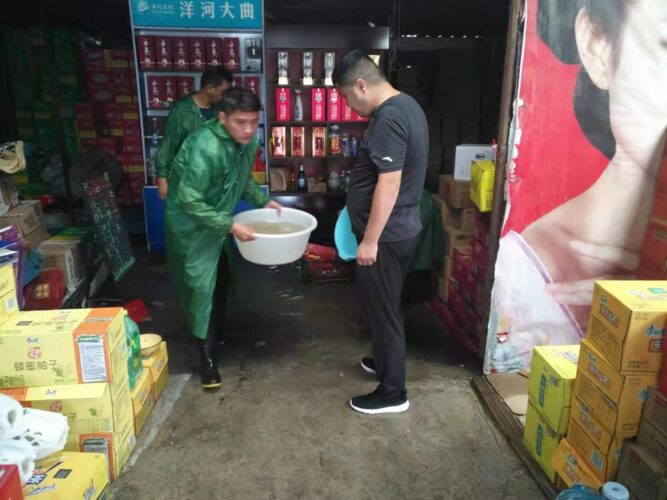 管委会周军民主任一看商铺内积水严重,当即下达指令。要求十几个工作人员立刻帮助市场商户排水。工作人员有的穿上胶鞋、雨衣,有的来不及换鞋就跳进水中,拿着大大小小的盆子、桶开始往外端水。管委会刘涛副主任、靳朝阳副主任挽起裤腿和大家一起帮忙排水。从上午8点到下午七点多,大家没顾上喝一口水,吃一口饭。但这样排水需要时间较长,为了尽量减少商户的损失。周军民主任当机立断,打电话给东城区环卫大队借调抽水车。