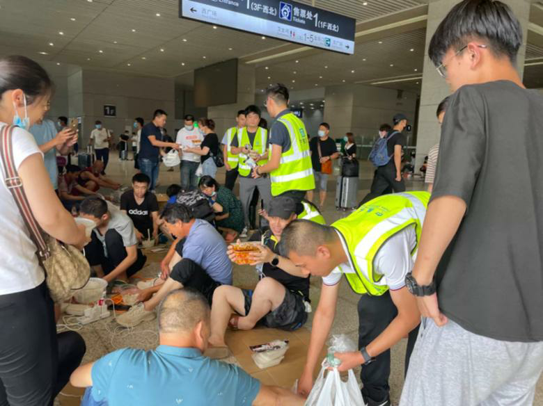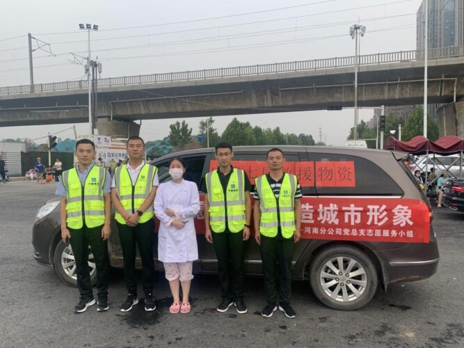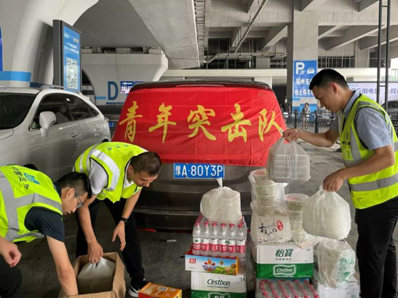 在得知郑州东站滞留大量旅客的消息后,河南分公司党总支迅速响应,立即组织13名志愿者成立“青年先锋队”,为郑州东站滞留旅客送上一百余份热腾腾的饭菜和开水。同时,志愿队还为金水区郑开大道与东四环连接路口的救援队伍送矿泉水、方便面等救援物资。