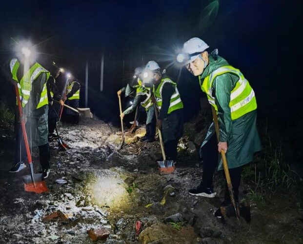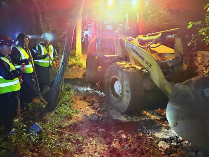“村里情况不容乐观,请全体队员立刻按照计划推进工作!”项目部领导班子在仔细查看现场后,制定严密的工作计划,兵分两路,用最短的时间抢修入村村路。当晚大雨持续不断,抢修工作紧张地开展,一队负责用水泵抽水,二队负责抢修道路。期间由于道路太过泥泞,挖掘机几次陷进土里,队员们找来大块石头,拼尽力气才把挖掘机“解救”出来,继续执行任务。“梅总,柴总,你们都歇会吧,换我们来做!”副经理梅亚祥、生产经理柴杨涛脸上早已分辨不清是汗水还是雨水,队员之间相互鼓劲儿,不分你我地进行抢修。