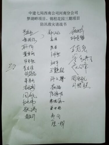 救援队成员在誓师大会上鼓振士气,并一一签下请战书。这支30人组成的抢险救援队,由项目经理郑顺福带队,高举抢险救援队、党员先锋队及青年先锋队三面旗帜,整装待发。本次救援行动出动铲车2台、水泵5台、沙袋500个、dn100水袋1000米及配件等,在23日下午8点抵达新乡市原阳县黑铵村。