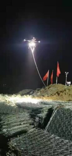 到达现场后,应急救援小组即刻对天枢-A8展开调试。25日0点左右,天枢-A8升空。天枢-A8是国内目前50-300米高空唯一平台型产品,升空后为本次抗洪抢险提供了2000~3000平方米晚间照明保障。天枢-A8还搭载了侦查监控功能,在决口处上空实时采集高清可见光视频和热成像视频,并传输至地面供现场指挥人员查看封堵情况。