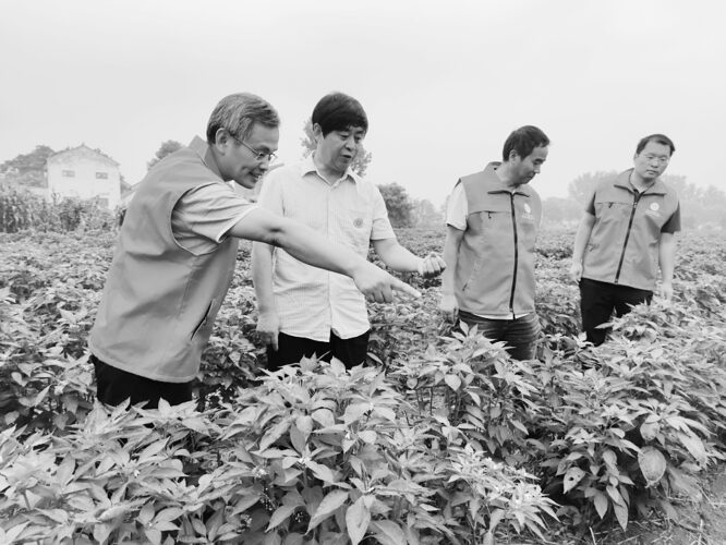 郑州蔬菜研究所专家在朝天椒机械直播示范基地查看辣椒长势。