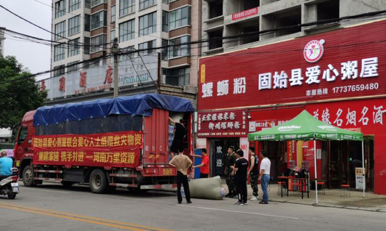 固始县爱心粥屋联合华联商业有限公司、万里资源有限公司、赵岗小学84届校友、志愿者爱心服务群、美铭商贸有限公司等社会各界爱心人士共同出资捐赠包括纯净水、方便面、面包、面粉、牛奶、食用产品和蚊香、雨鞋、夏凉被、消毒液、纸巾等价值20万元的生活必需品。同日上午9点,一辆满载各类救灾物资的卡车从固始县爱心粥屋出发,驶往安阳市内黄县。