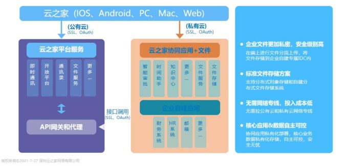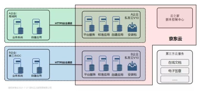 云之家专属云意图打造“拎包入住、开箱即用、一小时可用、私有云托管部署”的完全私有化云平台,提供更多的第三方生态能力,实现企业客户的快速个性化定制需求。这类部署模式,即可以保障企业数据安全,又可以灵活面对自然灾害导致的服务器瘫痪问题。