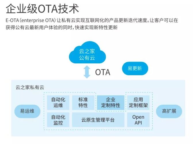 相比公有云来讲,私有云安全、合规且更可控。对于大型企业来讲,出于数据安全性、系统稳定性、软硬件自主权、自主可控以及在完整生命周期内TCO(总体拥有成本)低等需求考虑,其更加倾向于建设企业私有云来承载内部业务信息系统的运行。云之家还提供企业级OTA升级(Over-the-Air Technology,空中下载技术)解决混合云和私有云的产品迭代难题。