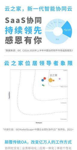 云之家是面向企业服务的移动办公平台&新一代智能协同云,我们坚持以客户为中心,以奋斗者为本,以全心全意为企业服务、改变亿万人工作方式为公司使命,致力于成为值得托付的移动办公行家。据研究机构IDC数据显示,2015年起云之家连续三年蝉联大中型企业移动办公市场用户数第一;2018年至今持续摘冠中国SaaS协同软件市场;2021年IDC发布的《中国企业团队协作云2021厂商评估》报告中,云之家位居领导者象限。