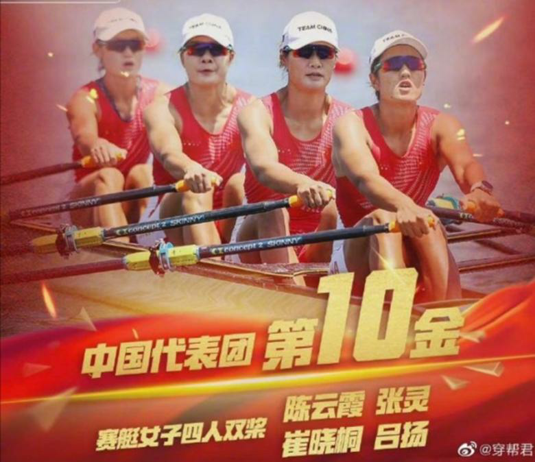北京时间28日上午,在东京奥运会赛艇女子四人双桨决赛中,由陈云霞、张灵、吕扬、崔晓桐组成的中国队夺得金牌,为中国代表团,夺得本届奥运会第十枚金牌,这也是中国女子赛艇四人双桨项目时隔13年再夺冠军,创造了世界最好成绩!