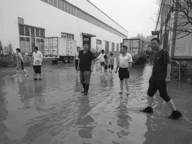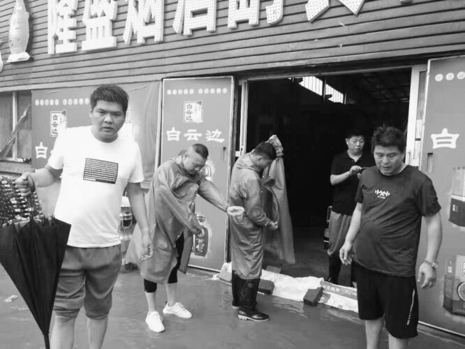 管委会周军民主任一看商铺内积水严重,当即下达指令,要求十几个工作人员立刻帮助市场商户排水。工作人员有的穿上胶鞋、雨衣,有的来不及换鞋就跳进水中,拿着大大小小的桶开始往外提水。管委会副主任刘涛、靳朝阳挽起裤腿和大家一起排水。从上午8点到下午7点多,大家没顾上喝一口水,吃一口饭。但这样排水需要时间较长,为了尽量减少商户的损失,周军民当机立断,打电话给东城区环卫大队借调抽水车。