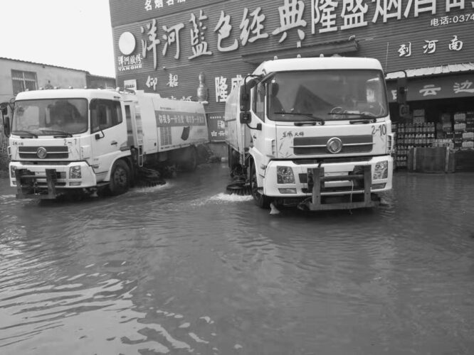 七辆环卫抽水车驶进市场,开始抽院子里的积水。一直忙到晚上7点多才离开。刘涛和相关人员又排查了市场隐患后,才赶回去开会。