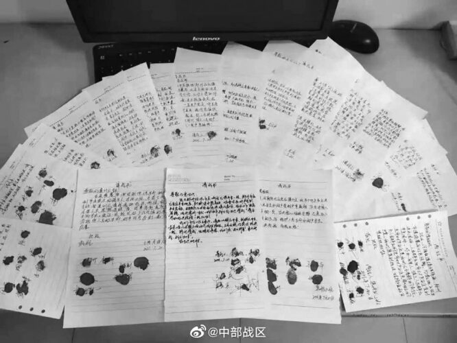 郑州某汽车团某连战士连夜递交的58份请战书。(资料图片)