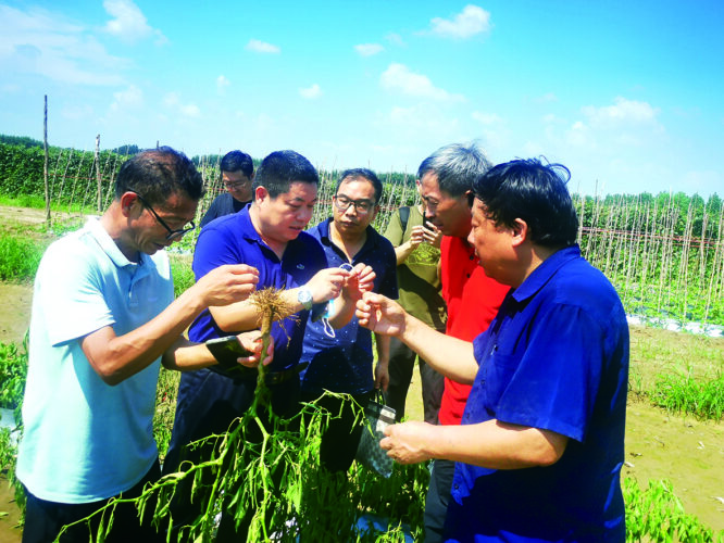 7月26日,省农科院植保所蔬菜园艺病虫害研究室王恒亮研究员、高新菊博士奔赴郑州“菜篮子”供区中牟县韩寺镇古城村指导灾后蔬菜病虫害防治。