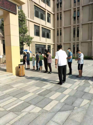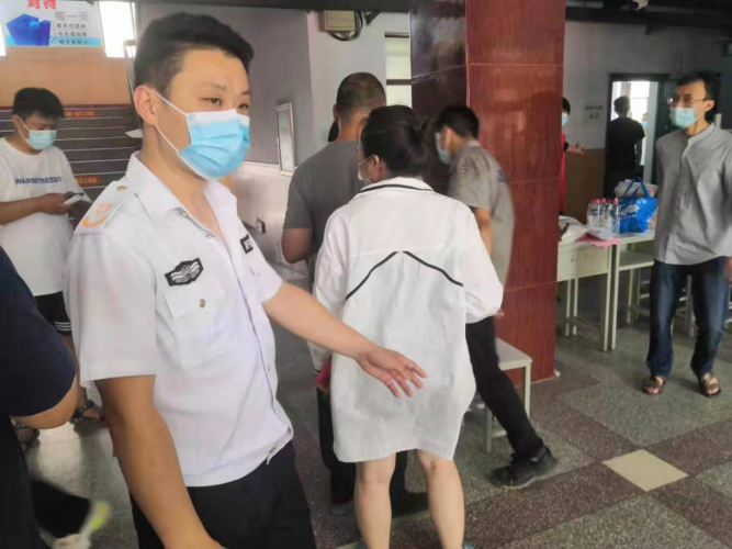 8月1日下午1点,金水区北林路巡防中队全员上岗,为辖区内的核酸检测采集点现场维持秩序。因此次检测时间紧、人员多,检测方法为每十人为一个检测组,巡防队员一遍又一遍地喊话:“请大家排好队,十人一组,亮出已登记的二维码。” 嗓子喊哑了,大家就轮流喊。烈日下,汗水浸湿了衣服,没有一个人叫苦叫热。据巡防队员介绍,辖区内共有11个检测点,户籍人口近八万,加上商户,预计需要检测十万人。