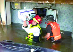 苗号扬(左)和参与救援的志愿者转移群众的财产。