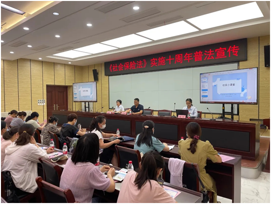 在《社会保险法》实施十周年之际,开封市禹王台区人社局携区社保中心深入机关事业单位开展社会保险普法宣讲会,进一步强化社会保险法律意识,为《社会保险法》的贯彻实施营造良好的氛围。区社保中心副主任闫寒主讲,区属机关事业单位社保业务负责人参加。