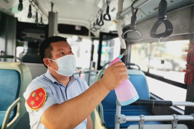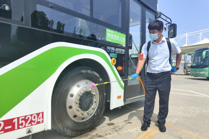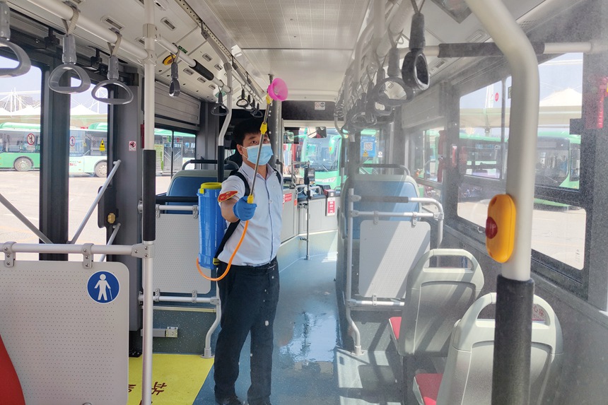 “公交车辆的消杀一般分为两种情况:一种是深度消杀,要对车辆内外进行喷洒和擦拭,就是‘喷、关、擦’,每天早晚各一次,每次大约需要一个到一个半小时;另一种是趟间消杀,即每趟车回来都要消杀,概括为‘一提二退三喷四登记五关门’……”杨王记滔滔不绝地为大家传授经验。
