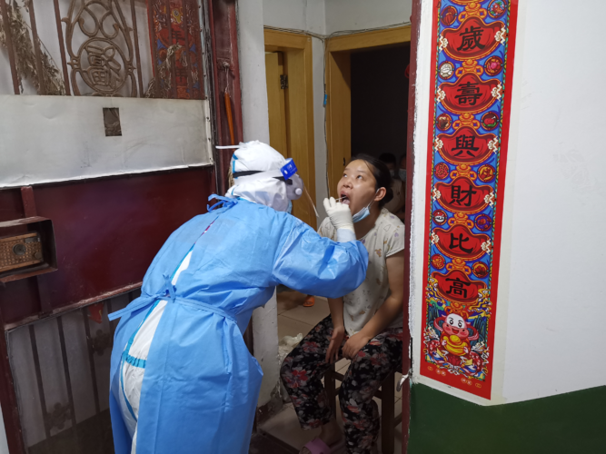 为协助好医护人员的工作进展,社区党委书记张丹身先士卒,带领社区工作人员穿上防护服,走进隔离户家中,进行鼻咽拭子、咽拭子的“双检”工作。顶着炎炎伏天烈阳,从这条路走到另一条街,从这个院走到另一栋楼,从一楼到六楼,从这家走到另一户,核实信息、测量体温、录入信息、贴检测标、“双检”采样、清理废物,每一位检测人员在防护服下早已大汗淋漓。