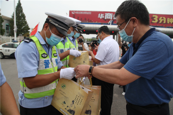 张柏华副院长一行在交警支队党委委员、警务保障大队大队长张明星的陪同下,先后来到连霍高速商丘站疫情防控卡点、交警支队,为执勤交警送来了由医疗专家科学配方,该院加班炮制的液体中药共100份,送到交警手中。张柏华副院长称,当前,疫情防控正处于关键时期,疫情扩散的形势异常严峻,在这场疫情防控战役中,坚守一线的交警们,依然全力以赴、竭尽全力为市民把好“第一道重要关口”,因为有交警的守护,才让我们感受到更加安全的保障。“交警用行动筑牢了一层防护墙,为提高交警的抗病能力,我们连夜炮制部分中药,力所能及提供给交警,略尽绵薄之力。”