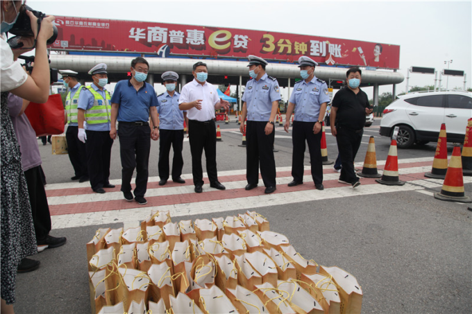 8月12日上午,商丘市中医院副院长张柏华、中医院工会主席郭玉峰受院长李德怀的委托,先后到连霍高速商丘站疫情防控卡点商丘市公安局交警支队看望慰问一线执勤交警。以表达市中医院全体人员对日夜坚守在疫情防控一线交警的健康关怀和崇高的敬意。交警支队党委书记、支队长张政勇,交警支队党委委员、警务保障大队大队长张明星,交警高速大队大队长汪华山、副大队长李文斌等陪同。