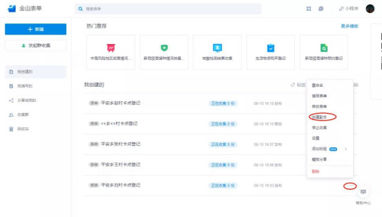 然后,选择“回到首页”,找到刚刚创建的表单,点击右侧的“…”,选择“创建副本”,复制一个新的表单。