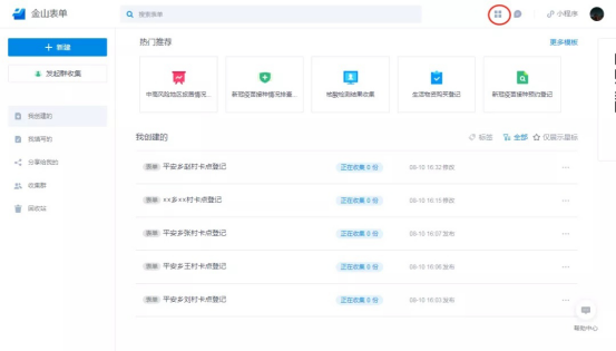 在金山表单的界面,点击下面红圈中的按钮,进入上级界面:金山文档。