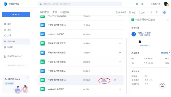在左侧列表,选择“我的文档——应用——我的表单”,就会看到自己所创建的所有卡点登记表单。每个表单会有两个同名文件,文件名之前的图标用以区分文件类型。其中