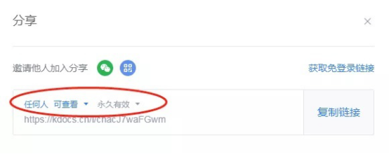 点击相应汇总表之后的“分享”按钮,进入分享界面。为了防止他人误删更改信息,建议采用下图的权限设置,然后点“复制链接”,在微信里粘贴并发送给相应卡点的负责人(每个卡点的信息汇总表只需分享一次,以后进入,数据将实时自动更新)。特别要提醒卡点负责人,一定不要将这个链接转发扩散,如果造成登记人员个人敏感信息泄露,有可能会承担法律责任的。