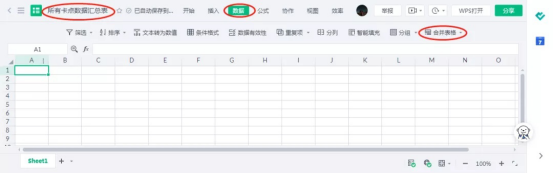 再次回到金山文档的首页,选择“新建——表格——新建空白表格”,这个表格就将作为汇聚所有卡点数据的工作簿。在下图界面中,先修改左上角的工作簿名称,选择“数据”菜单,再点击“合并表格”。