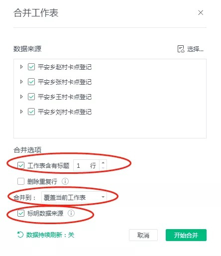 在弹出的合并工作表窗口中,点击“选择”,进入“我的文档——应用——我的表单”(首次进入较慢,请耐心等待),勾选各个卡点的后台数据汇总表,注意设置好红圈标注的几个选项,然后点击“开始合并”,就大功告成了。以后,每天需要汇总数据时,打开这个工作簿,再次点击合并表格,然后点击“再次合并”,数据就会更新了。