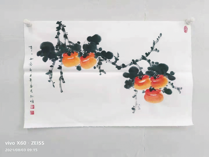 杨静伟先生毕业于河南省平顶山教育学院美术系,现为中国煤矿美术家协会理事,河南省书画学会平顶山分会书画院副院长。我曾多次走进杨老师的画室,看到墙上一幅幅《事事(柿柿)如意》作品,给了我许多思索和感悟,柿子不仅是一种味美的水果,还是一种吉祥的图饰,其果实形状,丰厚圆硕,形似如意,又因柿与“事”谐音,人们便将诸多吉祥内涵融入其中,如“四(柿)世同堂”“事事安顺”“事事有余”“事事如意”等,由于柿子代表着吉祥、丰收、喜庆、如意,预示着人们在生活上、工作上、事业上,事事如意。因此,就成为了画家所钟爱的一大绘画题材,柿子历来被古今画家所喜爱,画入国画,被人们所追捧、所钟爱。
