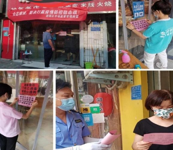 “根据要求,请各所立即组织排查,辖区所有餐饮店禁止堂食……”接通知后,各基层所立即召开会议,按网格包干、邀请个私协会参与,一切有条不紊地开展。全体人员再次走街串巷,手持《严禁提供堂食》公告逐户向经营业主和顾客解释聚集用餐的疫情传播风险,逐户张贴公告,不足一天时间,全区4538户餐饮单位全部暂停堂食。