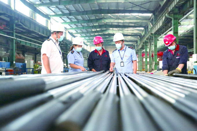 围绕辖区精品钢及深加工特色产业,安阳市市场监管综合行政执法支队殷都大队大力开展质量提升行动,促进产业全面、协调、可持续发展。安阳龙腾热处理材料有限公司主要生产具有自主知识产权的高强风能锚栓、热处理超高强度锚杆、热处理高强螺栓等多种高性能棒线材产品,填补了我国尤其是中部地区的空白。其中,高强风能锚栓产品的市场占有率达到1/3。图为8月18日,在安阳龙腾热处理车间,殷都大队执法人员正在查看热处理后的锚杆。 毕兴世 摄