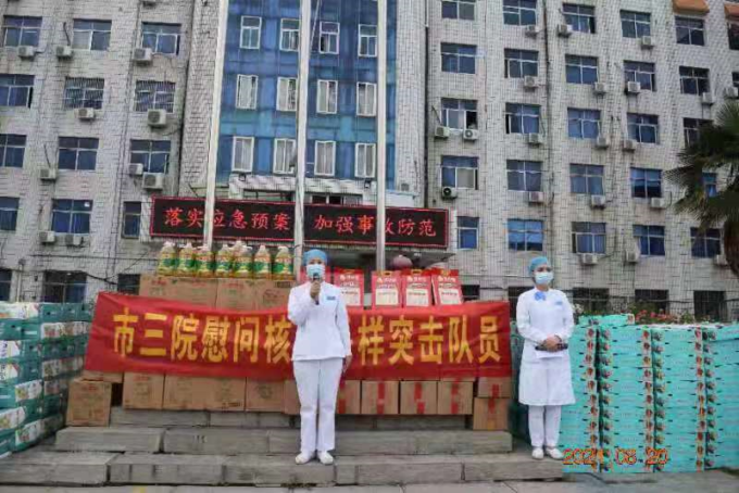 8月20日下午,我院党委组织慰问我院核酸采集突击队人员活动,并为她们及其家属送上感谢信和慰问品,党委班子成员、相关部门负责人出席了慰问仪式。
