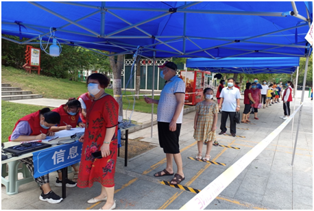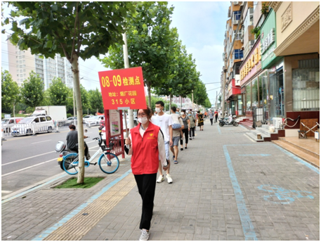 全员核酸检测当天,依托天桥街道志愿者党委、各社区小区志愿者服务站、点,大批党员、群众作为志愿者投身到核酸检测工作中,践行初心和使命,筑牢“红色防线”。在各小区、三无楼院,社区微信群、小区物业群里通知,播放喇叭再次通知,以栋楼为单位,10人一组,志愿者在楼下引领,分批次带领群众前往核酸检测点采集。在核酸检测点,志愿者配合工作人员维护现场秩序,避免人群拥挤及近距离传染风险,帮助不会填写居民核酸检测信息的群众填报信息;积极配合医护人员工作,引导居民持亮码检测、采样,有效缩短医护人员工作时间;批次采集结束后,及时向采集点负责人汇报情况,由采集点负责人、工作人员通知下一栋楼的居民准备前往核酸检测点,合理有序,避免中间断档。