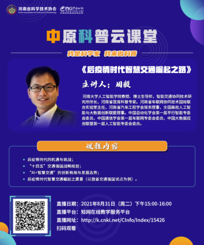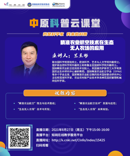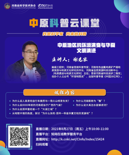 2021年8月27日、8月31日,由河南省科协主办,中国知网、河南有色金属地质矿产局地质旅游与地质文化研究所、隆平高科信息技术(北京)有限公司和河南大学共同承办的“中原科普云课堂”第15-17期直播活动即将开课。课程主题分别为:中原地区的环境演变与华夏文明演进、精准农业航空技术在生态无人农场的应用、后疫情时代智慧交通崛起之路。