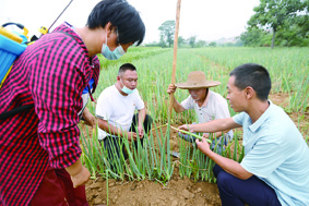 7月中下旬,连续的降雨导致安阳市部分乡村的农田被淹、庄稼受损,安阳市龙安区组织农技专家深入田间地头帮助农户指导田间管理。图为8月21日,在该区马家乡大桥村,农技干部户志强(右一)正在查看葱叶末梢的潜叶蝇(虫)病害情况,并提出治疗方案。 毕兴世 摄