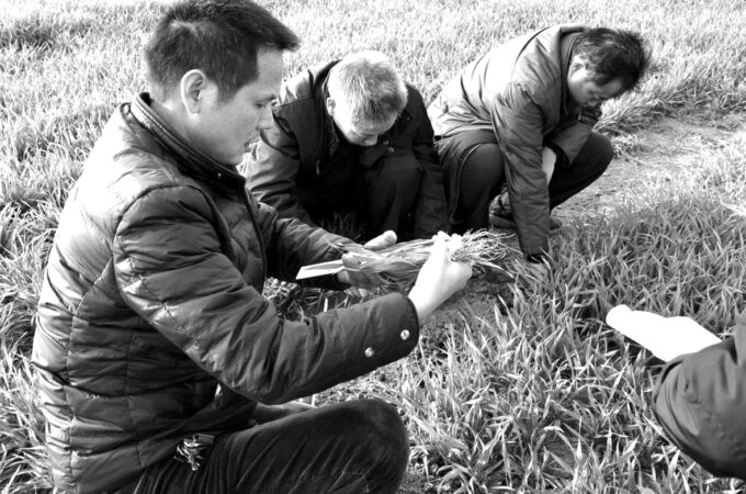 高敬伟(右三)带领技术人员到小麦绿色高产高效创建项目区进行小麦病虫害调查。(资料图片)