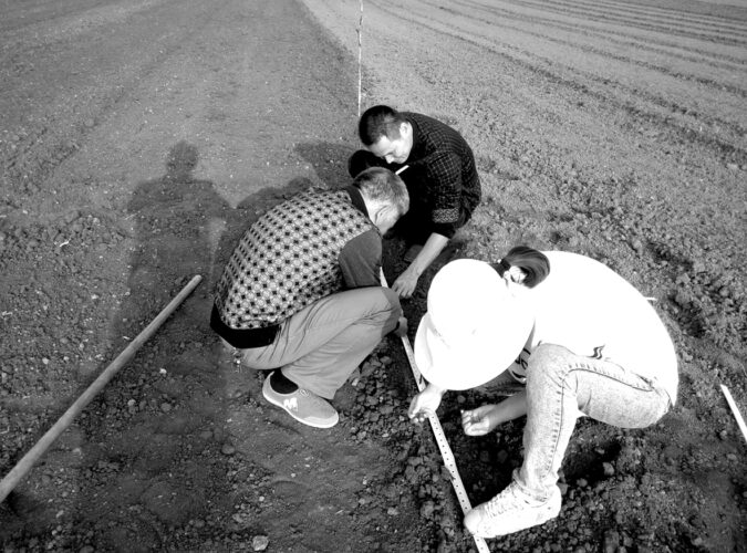 高敬伟(中)与同事在张楼乡吴集村进行小麦窄行精准匀播试验摆播。(资料图片)