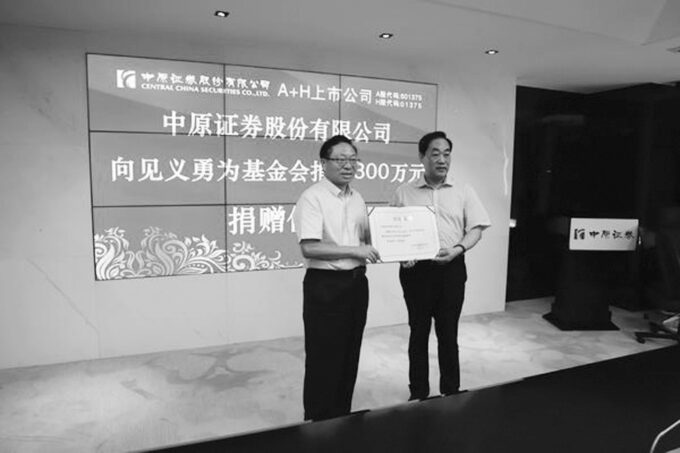 中原证券向河南省见义勇为基金会捐款300万元捐赠仪式现场。(资料图片)
