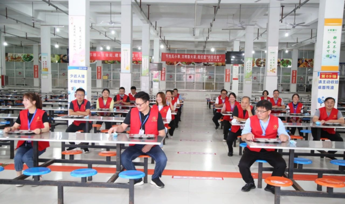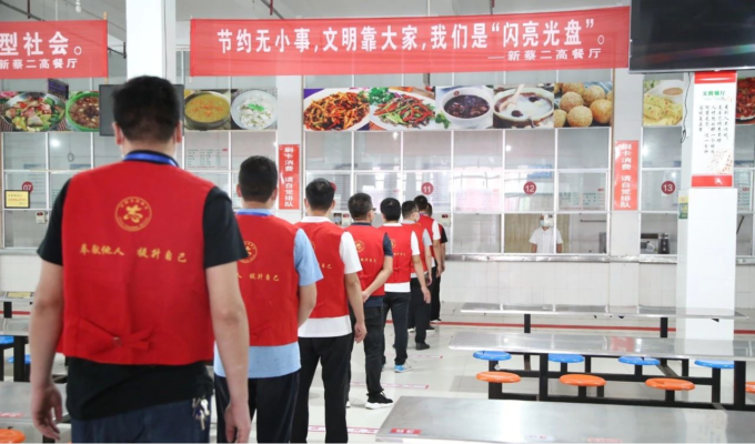 学生实行错峰就餐,进入餐厅后,按地标相隔1米排队取餐,然后按指示同向就坐,相隔1米以上。在突发发热事件演练中,学校模拟情境,设定突发情况,按照操作规程,及时启动应急预案,后续跟进进行排查、隔离、上报、示警、消杀等一系列规范程序。
