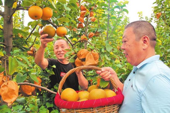 8月31日,果农在永城市刘河镇訾楼村高产高效梨园收获黄梨。近年来,该村在特色产业上做文章,打造集果品、苗木、餐饮、运输、休闲、旅游于一体的豫东新型果品基地,村民实现了家门口就业。