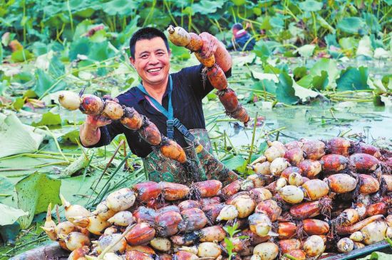8月31日,光山县寨河镇耿寨村新生合作社社员正在收获莲藕。今春,该合作社引进种植高效品种珍珠莲藕,采取“基地+合作社+农户”的模式,吸纳村民在家门口就业,实现增收致富。
