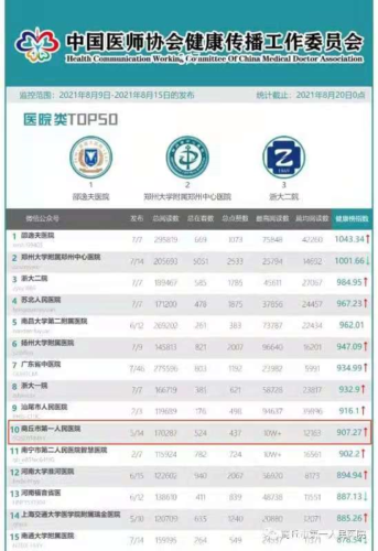 据了解,中国医师协会健康传播工作委员会微信影响力排行榜每周发布一次,统计的范围包括中国医师协会健康传播工作委员会所有成员单位的微信公众号2403个。第198期榜单统计时段为2021年8月9日至8月15日,统计数据截止到2021年8月20日零时。该时段,商丘市第一人民医院微信公众号编发文章14篇,总阅读数为170287,单篇最高阅读数10W+,篇均阅读数12163,健康榜指数为907.27。