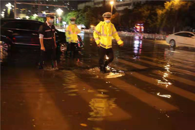暴雨来袭 商丘交警水中坚守一线保畅通