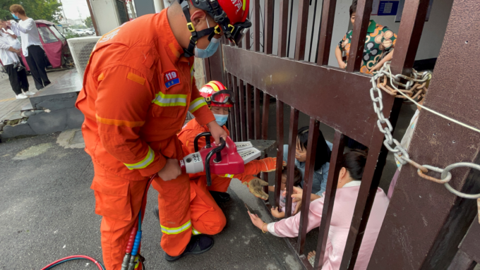 河南商丘:3岁女孩头部被卡住  消防员扩张铁门成功救出