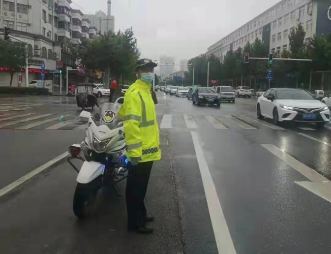 2021年9月6日早高峰,随着各行各业的开始复工,车流量、人流量逐渐增大,由于市区出现降雨天气,造成了道路湿滑、视线模糊,给过往车辆和行人带来安全隐患,为了有效应对降雨对市区道路交通带来的不利影响,商丘交警铁骑大队科学部署警力,采取定点执勤和巡逻相结合的方式,加大路面巡查力度,在辖区人流、车流较密集的路口、路段加派警力指挥交通,有效保障了辖区降雨天气道路交通安全、有序、畅通。